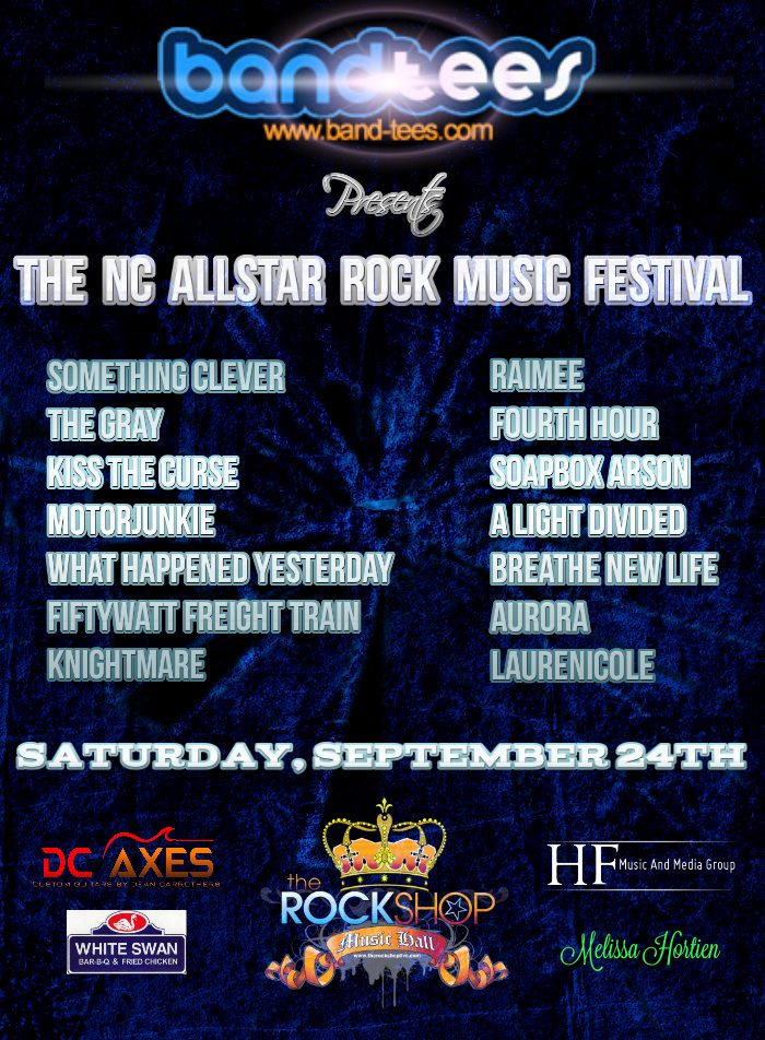 The bill included a variety of top rock bands from across North Carolina performing on two stages: Something Clever (Charlotte), Fiftywatt Freight Train (Charlotte), The Gray (Fayetteville), Breathe New Life(Fayetteville), Raimee (Greensboro), Motorjunkie (Fayetteville), Soapbox Arson (Greensboro), A Light Divided (Winston-Salem), 4th Hour (Fayetteville), Knightmare (Raleigh), Aurora (Lumberton), LaureNicole (Raleigh), Kiss The Curse (Raleigh), and Trailer Park Orchestra (Greensboro.) The 14-band festival also featured two sound engineers, two stage coordinators, five promoters, and countless volunteers dedicated to making the massive show a success.