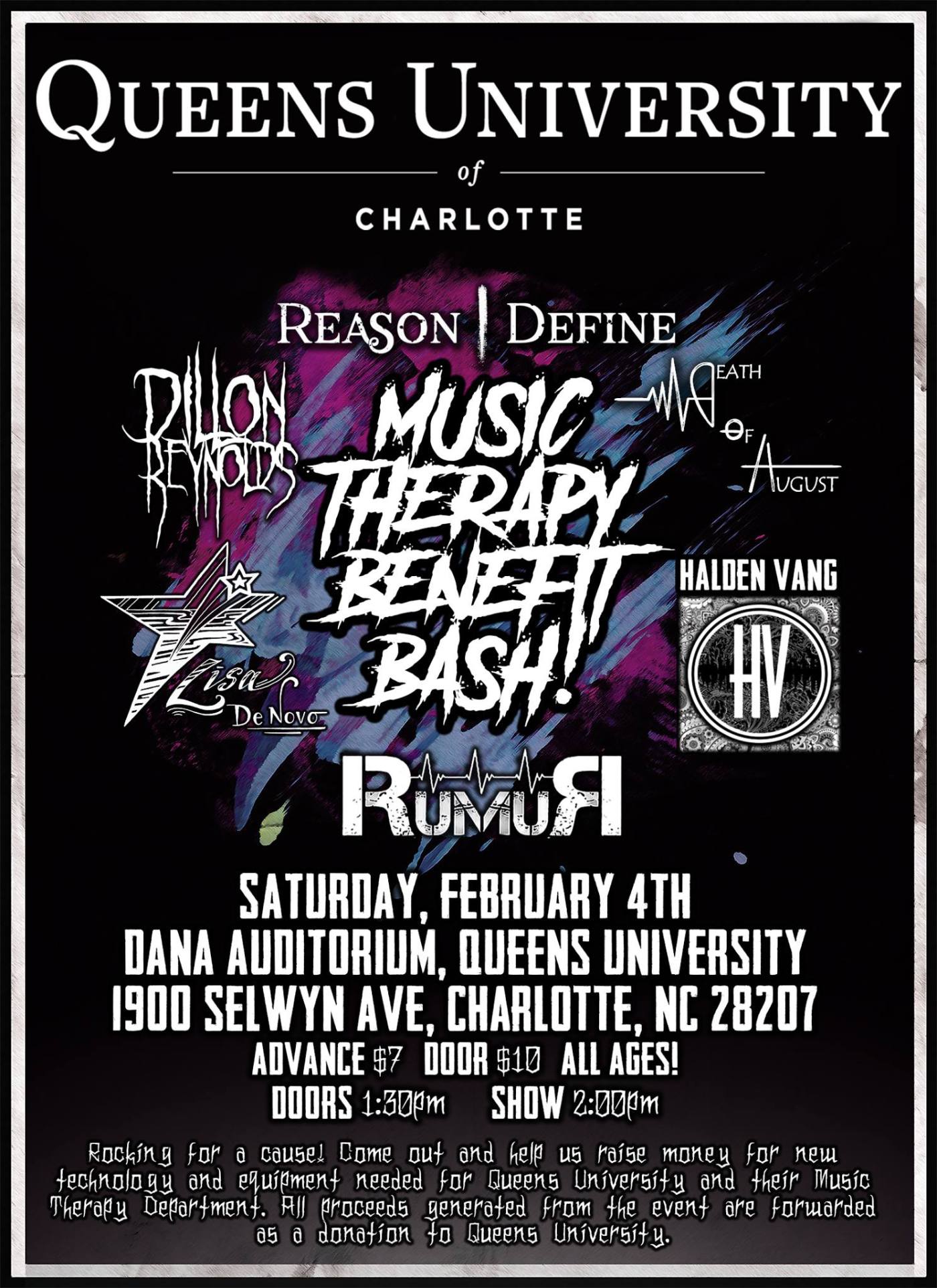 The Music Therapy Benefit Bash, created by Death of August’s guitarist and vocalist Helena Radeva as her senior project, was held on February 4th at Queens University in Charlotte, NC. The event was an interactive Service Learning Experience in which attendees had the opportunity to watch performances by local musicians, learn about the music therapy program and clinic at Queens University, and help make an impact on the program through their entrance fees and donations. All proceeds from the event went directly to Queens University’s Music Therapy Program to raise money for new technology that is needed in the clinic in order to facilitate interaction and communication within the program.