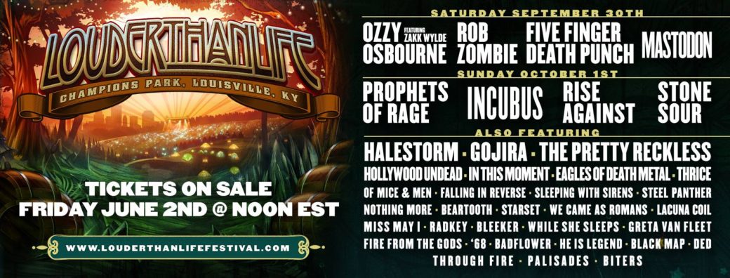 Ozzy Osbourne featuring Zakk Wylde, Prophets of Rage, Five Finger Death Punch, Rob Zombie and Incubus top the bill for the fourth annual Louder Than Life destination festival, Saturday, September 30 and Sunday, October 1 at Champions Park in Louisville, KY.