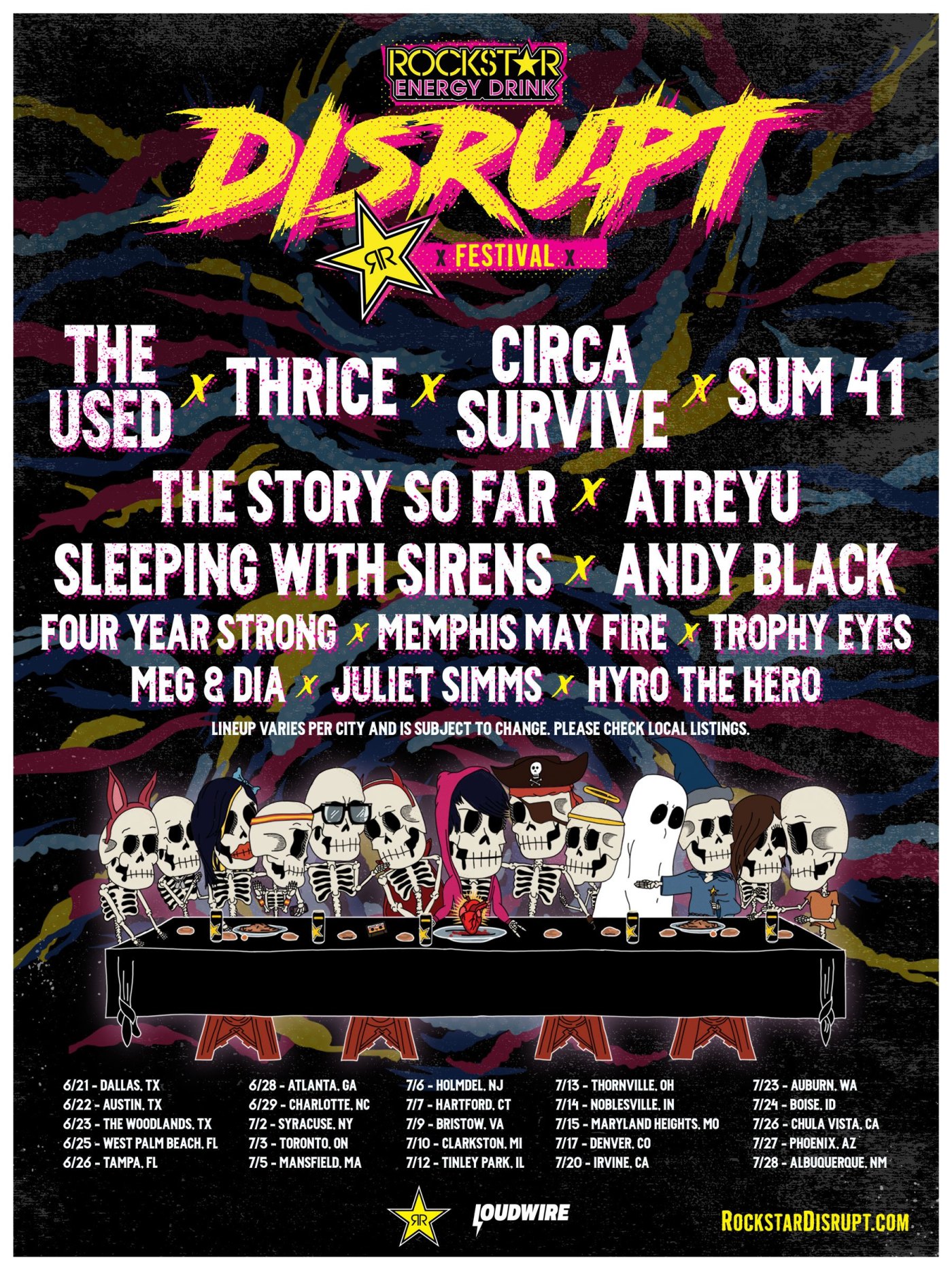 The touring festival will feature unique lineups in each city, including The Used, Thrice, Circa Survive, Sum 41, The Story So Far, Atreyu, Sleeping With Sirens, Andy Black and more. You can visit rockstardisrupt.com for full line-up details for each city.