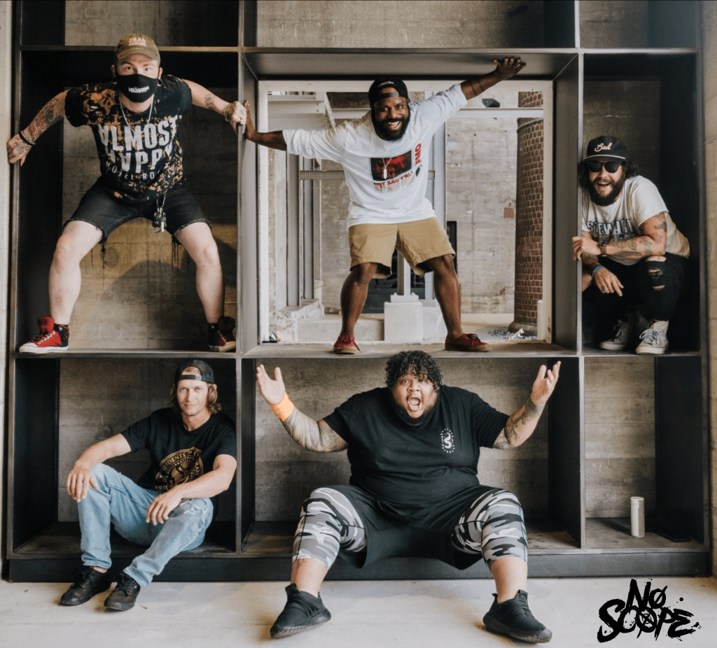 Winston-Salem, North Carolina pop-punk outfit No Scope’s second live show was almost a complete disaster. The 5-piece was set to play a local show at Local 506 in Chapel Hill, NC but their drummer, Preston, was unable to get the day off of work. They arranged a fill-in and after 3 weeks of practice, he had their set down and was ready to go…until he was struck with food poisoning on the day of the show. They almost canceled but at the suggestion of their booking agent, Chris MacIntosh of Get Sad Yall in Raleigh, NC, they decided to play a completely unplanned acoustic set. They called up their friend Corey from fellow local band The Comedowns and convinced him to come play cajon for their set. Corey showed up an hour before stage call, and they began frantically rehearsing.