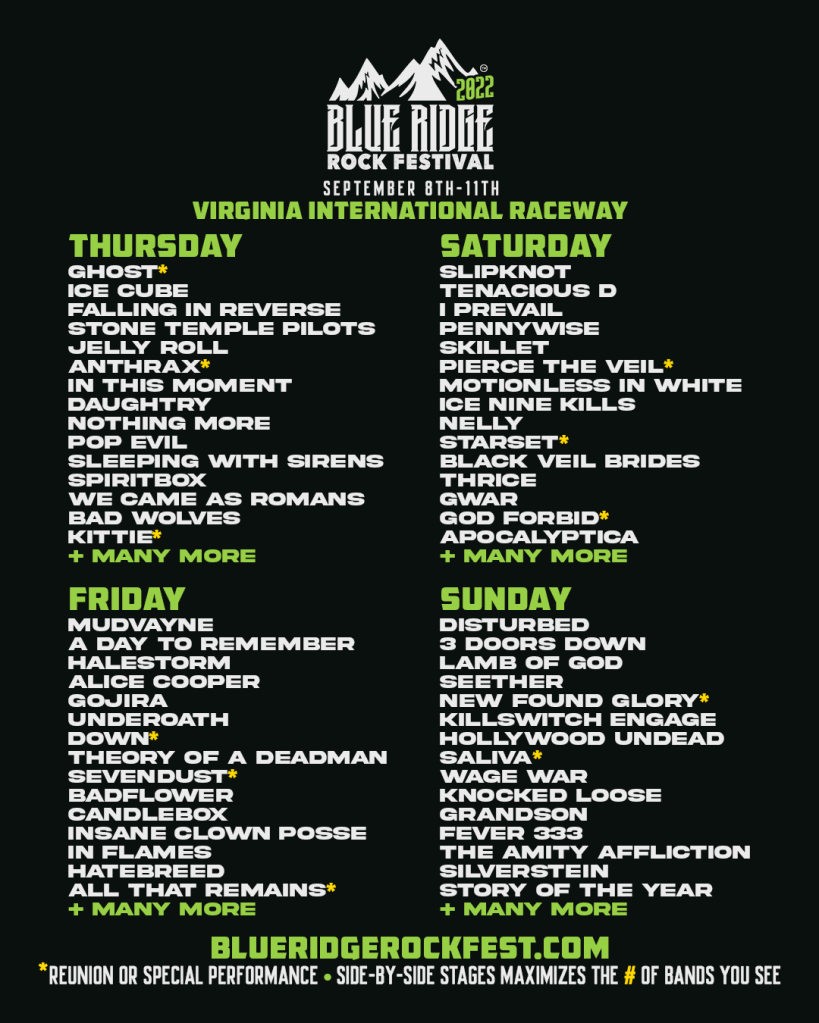 Blue Ridge Rock Festival returns Sept 8-11 at a new venue, the 1,400 acre Virginia International Raceway in Alton, VA. This year’s festival will feature more than 180 bands including Lamb of God, Ghost, Ice Cube, Mudvayne, Gojira, Alice Cooper, A Day to Remember, Slipknot, Pennywise, Ice Nine Kills, Motionless in White, Thrice, Disturbed, Killswitch Engage and many, many more. Tickets are on sale now!