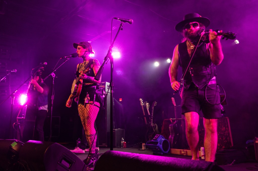 To start the evening, The Bridge City Sinners, with their self-described “Appalachian Death Folk” really got things moving. The band is fully acoustic and draws on old-time musical influences ranging from bluegrass to 20’s ragtime jazz, employing a lyrical tilt toward the macabre, and is bathed in an undeniable punk rock ethos that doesn’t require amplification to be apparent. Fronting the band, Libby Luxury plays an instrument that seems to be the unholy union of a banjo and a ukulele, captivating the audience with her mischievous presence, while wielding a voice that whip-saws from a sultry purr to a grindcore growl with ease and elegance. The Sinners as a whole blend into a perfect cacophony of fiddle, banjo, upright bass, and resonator guitar to deliver driving folk rhythms that are like the reincarnation of a bygone era.
