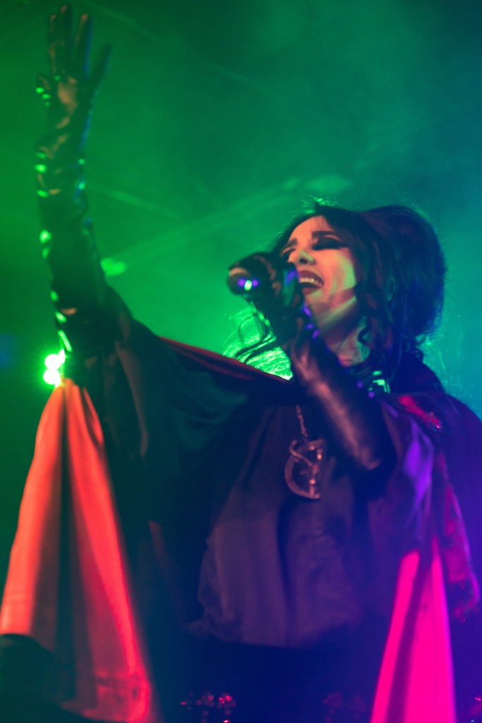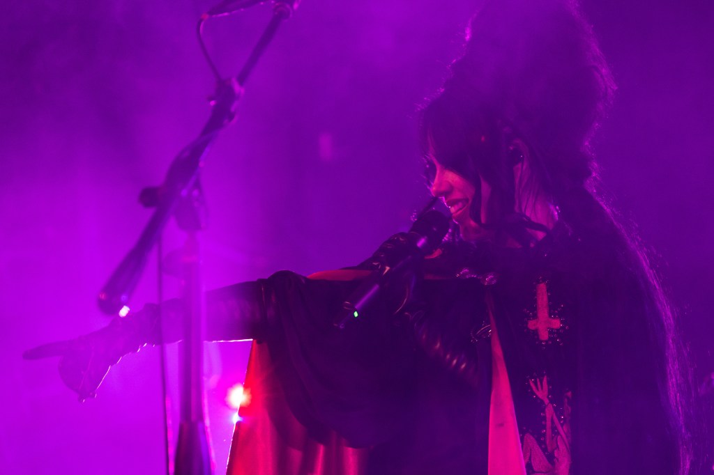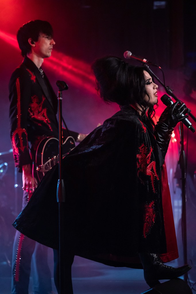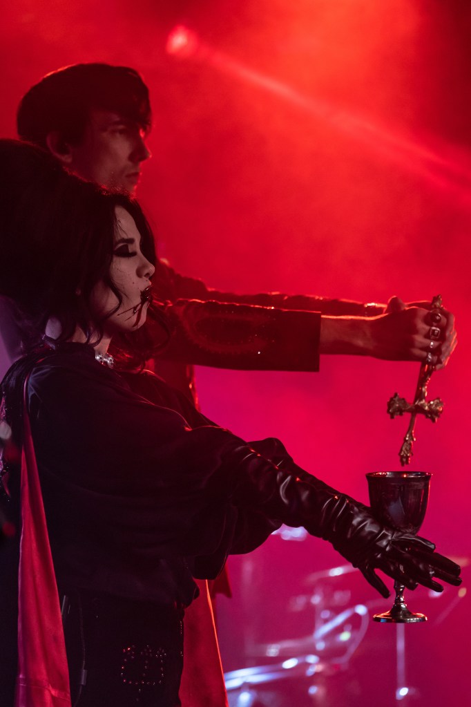 The evening could have ended there and been a resounding good time, but when Twin Temple took the stage things went to a whole other level. To begin, Twin Temple, a husband and wife duo, play Satanic Doo-Wop………like legit 50’s and 60’s early rock and roll, but with lyrics that pay homage to the Dark Lord and revel in the distinctly feminist reclaiming of Satanism’s core principle of free will. And then, there’s the aesthetic to consider……..full occult symbology……black robes and custom suits with little devils, pitchforks, and inverted crucifix. Candelabras line the rear of the stage, pentagrams are ever-present, Alexandra carries what appears to be a bible of sorts. Twin Temple delivers a full theatrical immersion into the underworld. Don’t allow yourself to think, however, that they are all schtick and kitsch. They absolutely have the songs to back up such an outrageous high concept, and lay them down with enough authority to keep the crowd shimmying all night long. The soaring chorus’, hammond organ, and blaring horns deliver a euphoric sonic experience that feel like coven anthems in the making. The final song was capped by the ritualistic imbibing of a chalice of blood, spilling down the front-woman’s lips as the final notes rang in the air and the unholy exuberance of the evening came to a close.