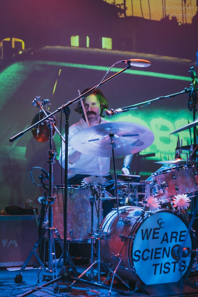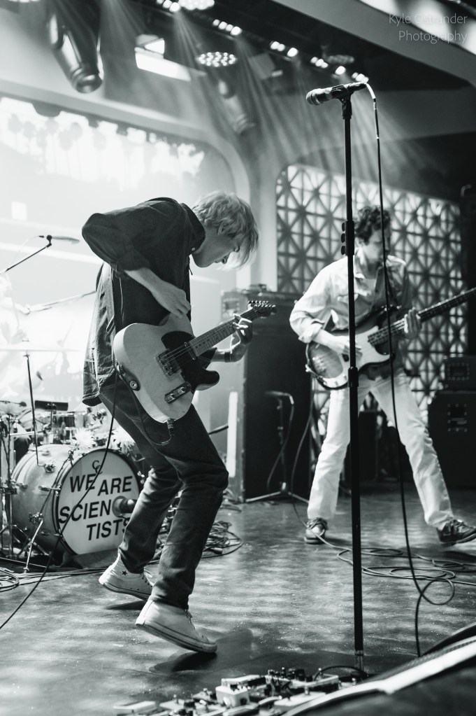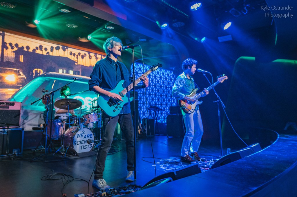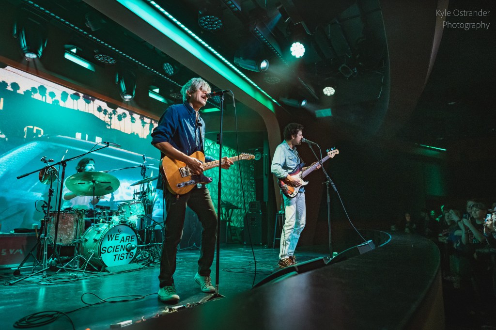 To celebrate the release of their new album Lobes, We Are Scientists took the stage at a packed and intimate Brooklyn, NY show last week. The room at Brooklyn Made was filled with excitement and anticipation as fans eagerly awaited hearing songs from the new album live for the first time. The band quickly delivered by kicking off with “Lucky Just To Be Here”, a pounding synth soaked track off Lobes. Throughout the night, the band played a total of 6 cuts from the new release. Make no mistake though, the 20 song set covered almost every era of the band’s nearly 20 year career. Tracks like “This Scene Is Dead”, “Rules Don’t Stop”, “Buckle”, and “I Cut My Own Hair” had the entire room singing and jumping along. Almost as entertaining as the band’s music was the famous stage banter between singer/guitarist Keith Murray and bassist Chris Cain, which all We Are Scientists fans have come to expect at any show. Topics such as learning Italian, modern New York slang, and jokes about math were all included in the between-song banter.