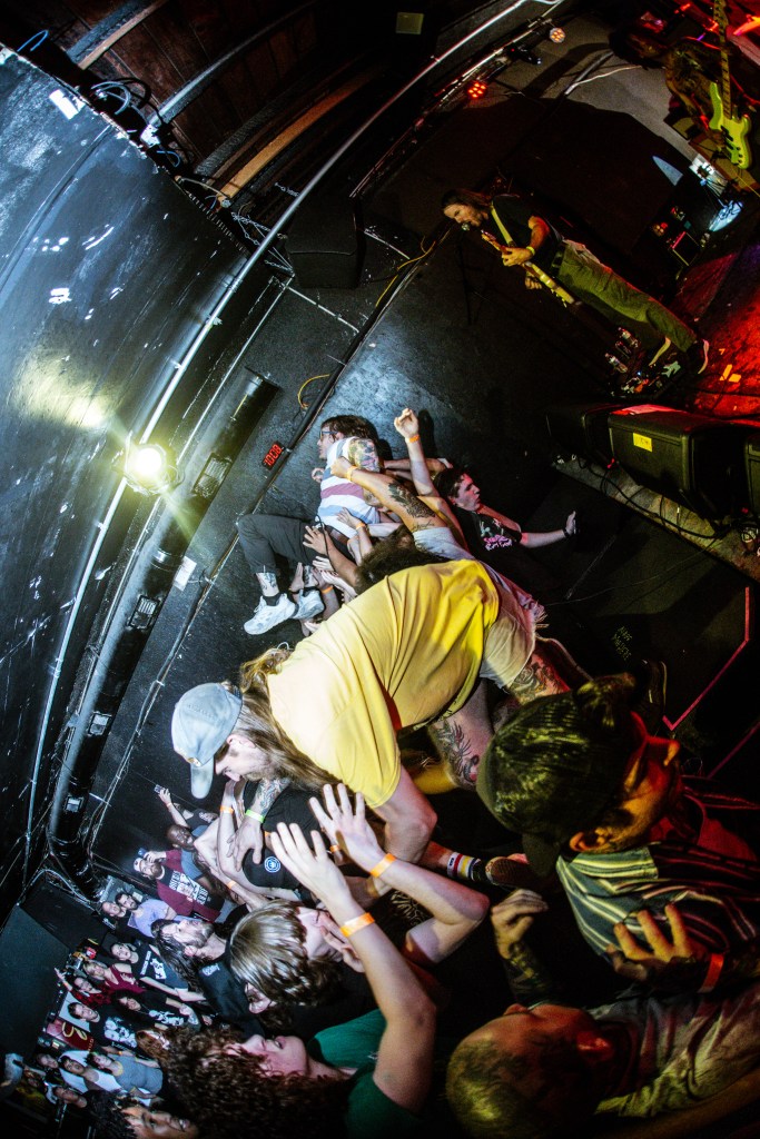 Lastly, Angel Du$t took the New Brookland Stage and absolutely crushed their 15 song set, giving us songs from A.D., Rock The Fuck On Forever, YAK: A Collection of Truck Songs, and Pretty Buff. Their entire set consisted of mic grabs and stage diving, wit the vocalist taking his turn to stage dive multiple times. One of the best parts of their set was when the vocalist got onto a fan’s shoulders to sing. He disconnected the cord from his microphone was could have been bad but the show went on by him using his guitarists microphone until everything was squared away. I had high expectations going into their set based off of videos I have seen of them and from what friends have told me but they blew me away and surpassed any expectations I had. They were one of the most fun and entertaining bands I have seen, giving us a good mixture of dancey songs with heavy songs and everything in between. If you like any subgenre of punk or hardcore music, Angel Du$t is definitely a band to add to your playlist as well as the ones that opened before them.